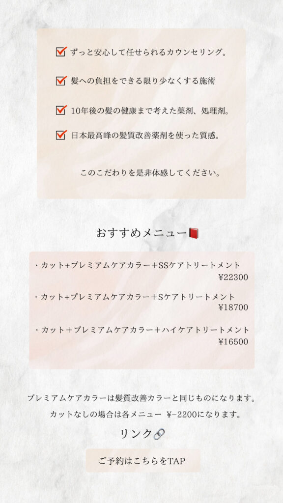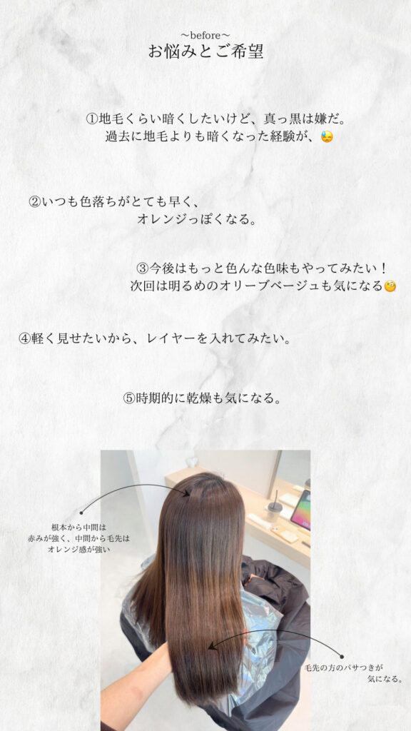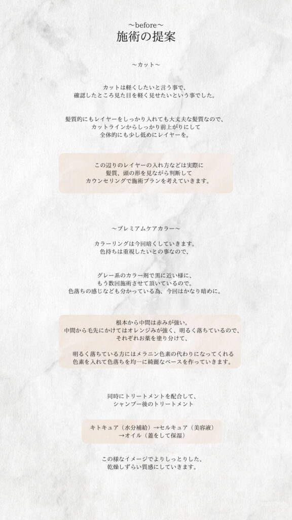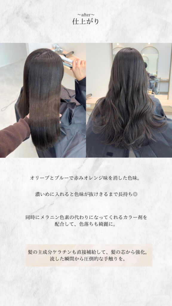 暗めグレージュ、ビフォア→アフター 2025 11/25 お客様ヘアスタイル、カウンセリング 2025年11月25日 お客様ヘアスタイル、カウンセリング よかったらシェアしてね! URLをコピーしました! URLをコピーしました! 【透明感暗めラベンダーグレージュまとめ】 この記事を書いた人 山本 祐輔 「ここしかできない繊細な色味の配合で作る透明感カラー」繊細で細かいレイヤーカットで扱いやすく柔らかい質感に。ケミカルの知識も使った、縮毛矯正と髪質改善で美しく、艶感のある【高級髪質感】 僕の作る雰囲気が好きな方は是非お待ちしてます‼︎ 関連記事関連する記事はまだ見つかりませんでした。 コメント コメントする コメントをキャンセルコメント ※ 名前 ※ メール ※ サイト 次回のコメントで使用するためブラウザーに自分の名前、メールアドレス、サイトを保存する。 Δ